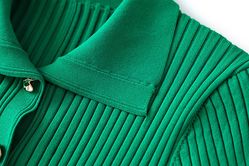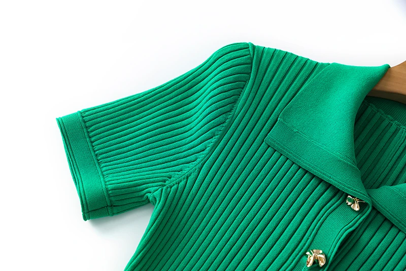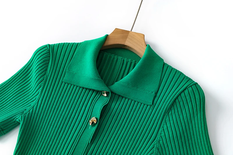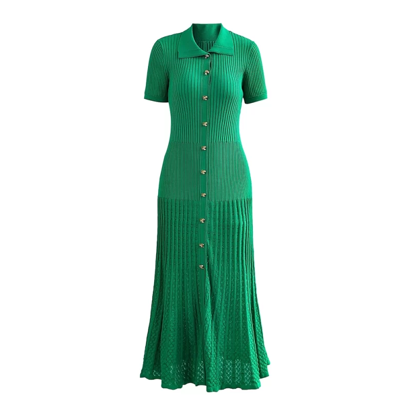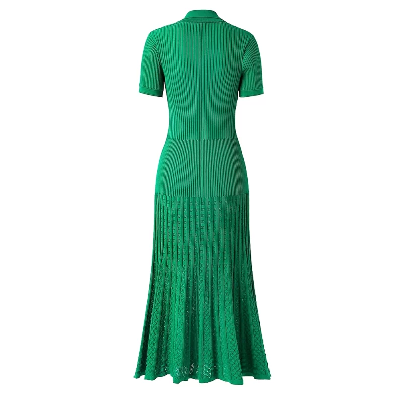 The dress features a sophisticated polo neck and short sleeves, perfect for the warmer seasons. The single-breasted button-down front adds a classic touch, while the solid color makes it versatile for both casual and formal occasions. The fit-and-flare silhouette enhances your figure, providing a flattering and feminine look.
