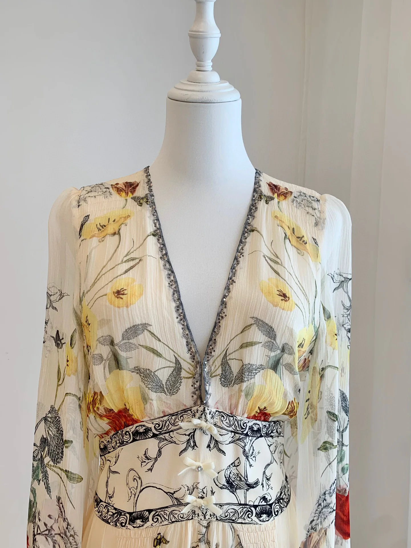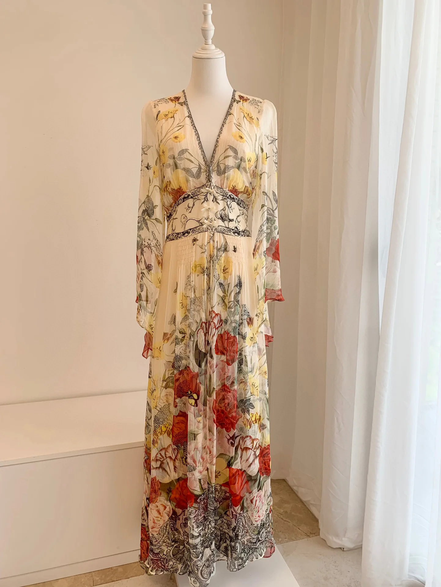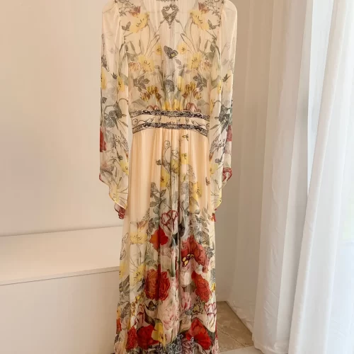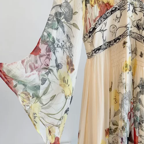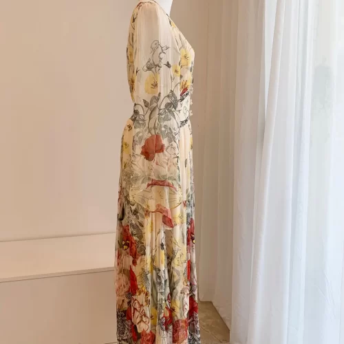 Step into elegance with our 2024 V-neck Beaded Green Flower Print Silk Dress with Ruffles. This stunning piece is crafted from high-quality silk, offering a soft and luxurious feel. The vibrant green floral print adds a touch of nature’s beauty, making it perfect for spring and summer occasions.