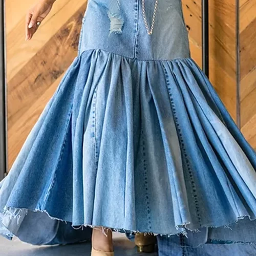 Embrace your curves with this plus-size fashion denim maxi dress featuring a sexy bow halter, sleeveless design, and casual loose mermaid style perfect for any holiday or casual outing.